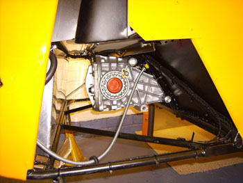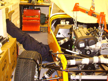 | The load leveller was one piece of kit that made fitting the engine a doddle. It still took us a few hours because I’m a bit….. OK then a lot fussy about causing any damage. Engine in, and I went underneath to fasten up the gearbox. This was post Christmas and I’m sure the car had got a bit lower on the stands, or was it me that had grown? |