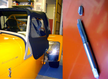 I wish I had a car sat at the side of me when I was fitting the doors, again I needed them to fit right and the best fit placed the hinge off centre of the steel strip within the door so I decide to drill and tap the door steels so that in effect I wouldn’t loose any structural strength in the frame once the screws were in. Last hole and ker…rack, 45 minutes later I remove the end of the offending tap and the doors go on. |